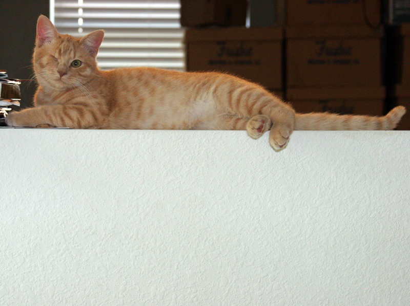Fred was my cat, my very best friend. Every pet owner will tell you their pet is the best but Fred actually was. Mistreated as a young cat before I got him Fred wound up with me after being rescued and cared for. He had only one functioning eye- his left eye- and was missing teeth. He was orange and white with the temperament of a cartoon character. A trifle overweight, Fred was a cookie-stealer. If you set your cookie down he would grab it with what teeth he had left, then settle for licking it. I lost a lot of cookies to Fred.