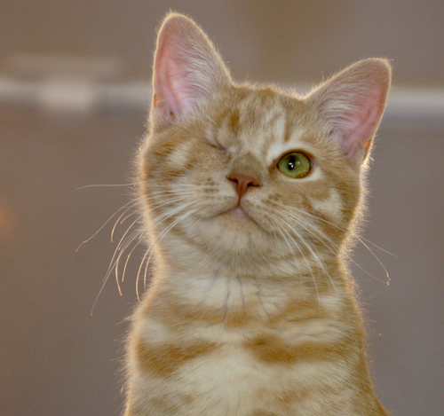 I went to see this kitten. Gabe brought her into an exam room with me. Then he left the room, closing the door behind him with me and this little one-eyed orange cat inside.