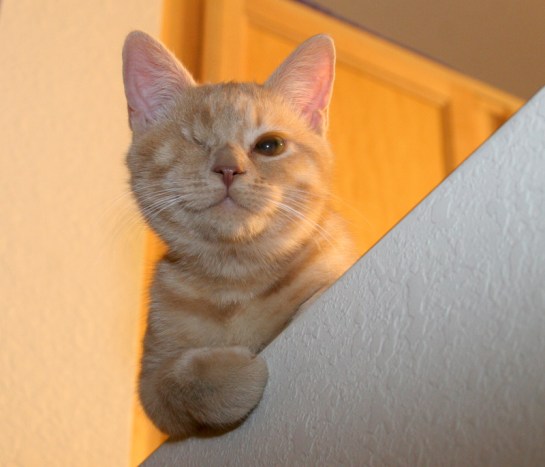 The cat walked around, jumped on the counter. It was extremely small. Only 7 months they said. It sniffed, moving its little head swiftly to compensate for only having one eye. Sunlight filtered through a window in the room.