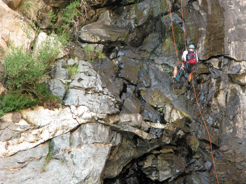 Canyoneering is the sport of descending the flooded canyons using climbing equipment, then swimming across the descending pools from waterfall to waterfall. Here a canyoneer rappels down a dwindling waterfall.