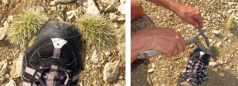 The “Teddy Bear” or “Jumping Cholla Cactus”, Cylindropuntia fulgida, is an annoying and dangerous plant. If you touch it the miniature barbs embed in your skin making removal difficult. Serious injuries for mountain bike riders falling on jumping cholla and hikers being impaled are common in the Southwest. Needles can be painfully lodged in the skin for weeks before they are expelled. These were imbedded in my shoe and had to be removed using two sticks.