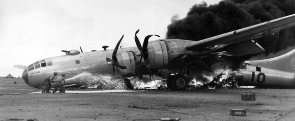 Returning from an Empire strike where it was “badly shot up, this Boeing B-29 Superfortress made an emergency landing on Iwo Jima’s 7th Fighter Command base. Damage to hydraulic systems caused a locked brake and a crash resulting in this fire. The entire crew escaped, some with minor injuries. The huge plane plowed up some Mustangs and construction equipment