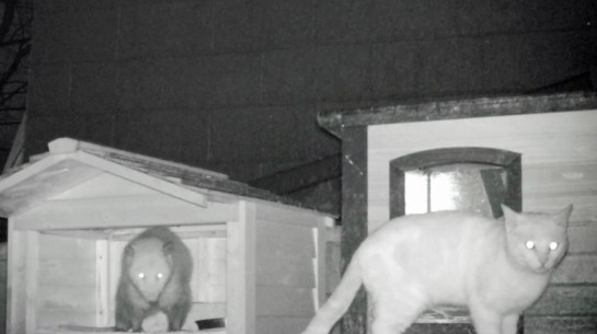 We were very excited when we found a small family of three opossums living in our yard, and have done everything we can to support them. We were also concerned that the local domestic and feral cat population, who we also support with four outdoor cat houses, might not interact well with our opossums.