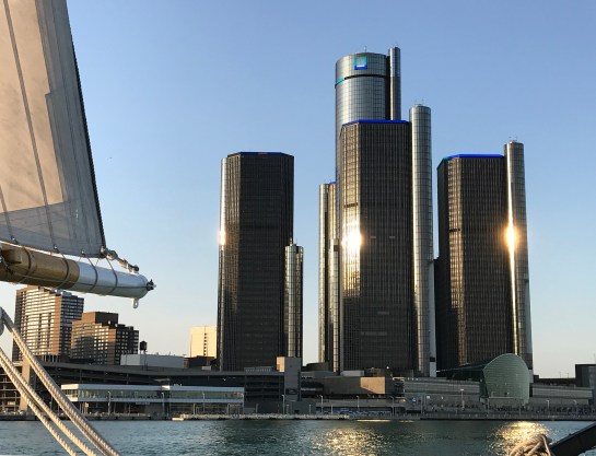 Once at the top of the river we reversed course under jibbing canvas sails, ducking under swinging booms and picking up winds that brought us downriver toward the majestic Ambassador Bridge. We sailed under, marveling at the incredible volume of truck traffic engaging in the free exchange of goods between Canada and the U.S. that typifies the relationship between the two countries.