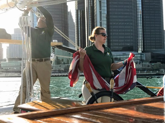 After casting off from the dock in front of Detroit’s Renaissance Center and General Motors headquarters we set sail on moderate winds and calm waters north and east toward Belle Isle and the Hiram Walker distillery. As we sailed across the Detroit River the strong and delicious scent of baking bread drifts off the Windsor shore from the Hiram Walker complex. The yeast processing for spirits production at the distillery produces the delightful aroma, lost on powerboats to their exhaust smell but blissfully preserved onboard the sail-driven Appledore IV.